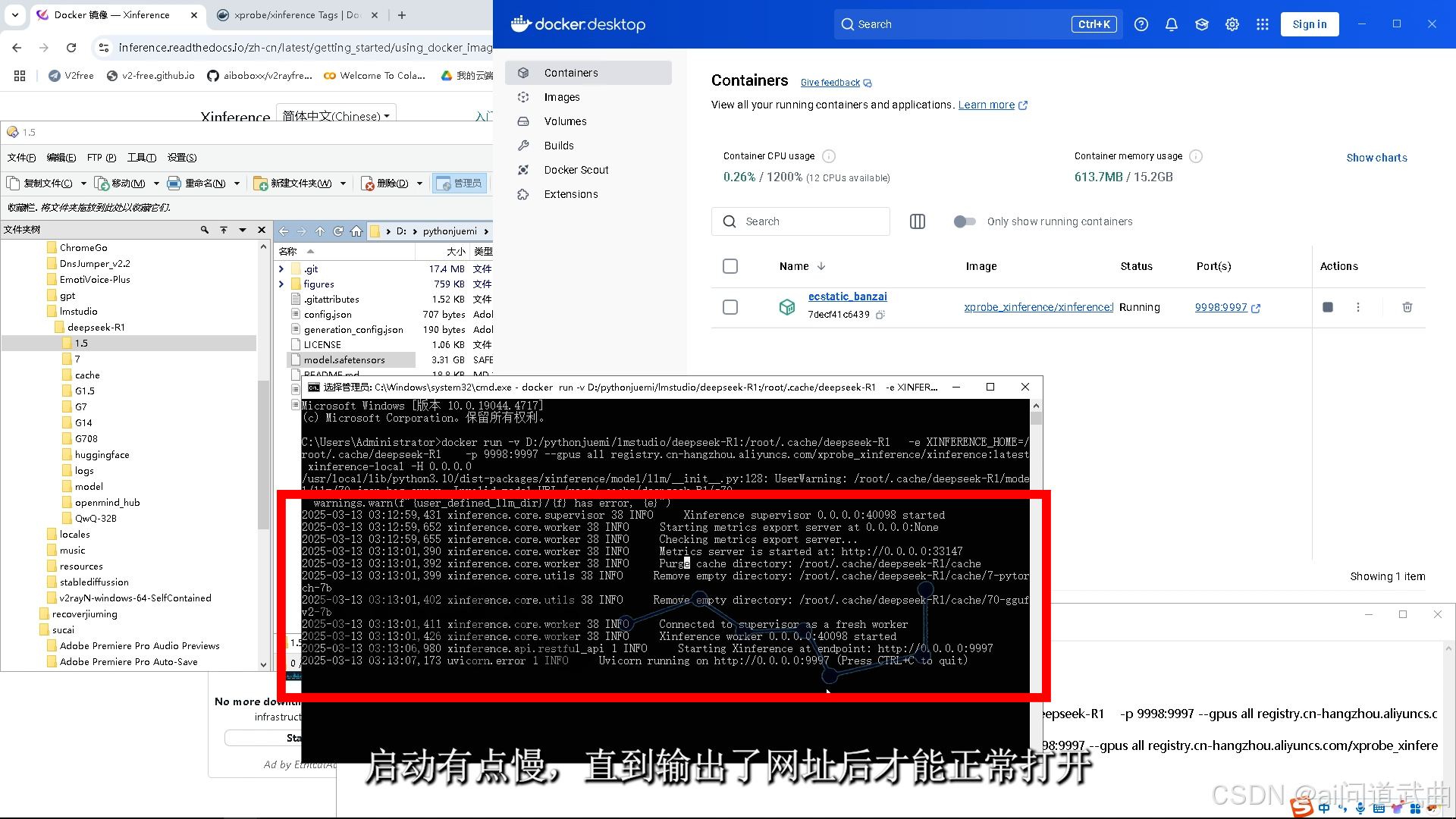 docker run -v D:/pythonjuemi/lmstudio/deepseek-R1:/root/.cache/deepseek-R1 -e XINFERENCE_HOME=/root/.cache/deepseek-R1 -p 9998:9997 --gpus all registry.cn-hangzhou.aliyuncs.com/xprobe_xinference/xinference:latest xinference-local -H 0.0.0.0