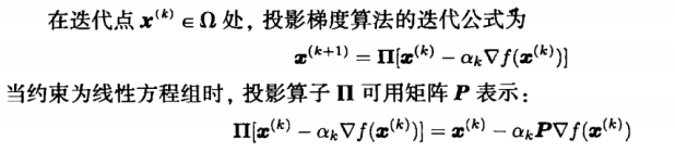 存在约束时,负梯度方向并不一定就是可行方向,因此可以借助投影矩阵P,得到迭代形式: