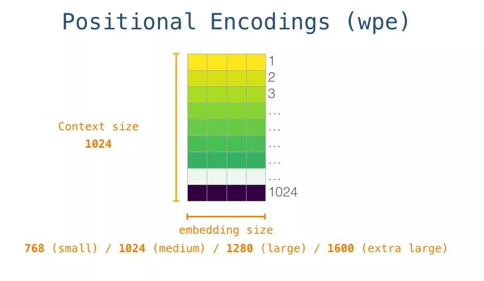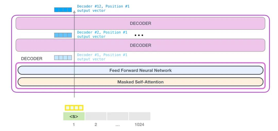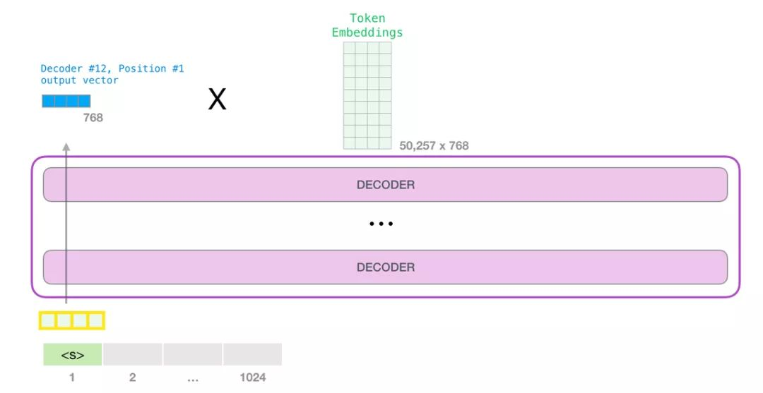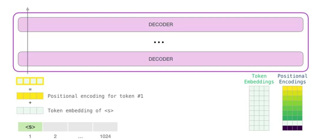 所以在一开始,我们需要在嵌入矩阵中查找起始单词<s>对应的嵌入向量。但在将其输入给模型之前,我们还需要引入位置编码——一些向 transformer 模块指出序列中的单词顺序的信号。1024 个输入序列位置中的每一个都对应一个位置编码,这些编码组成的矩阵也是训练模型的一部分。