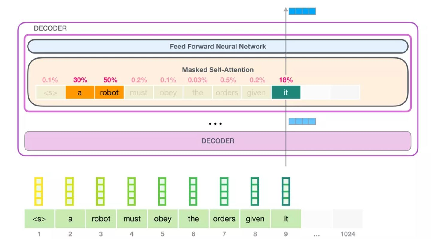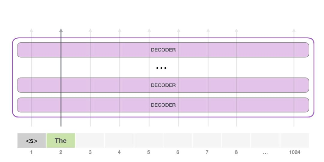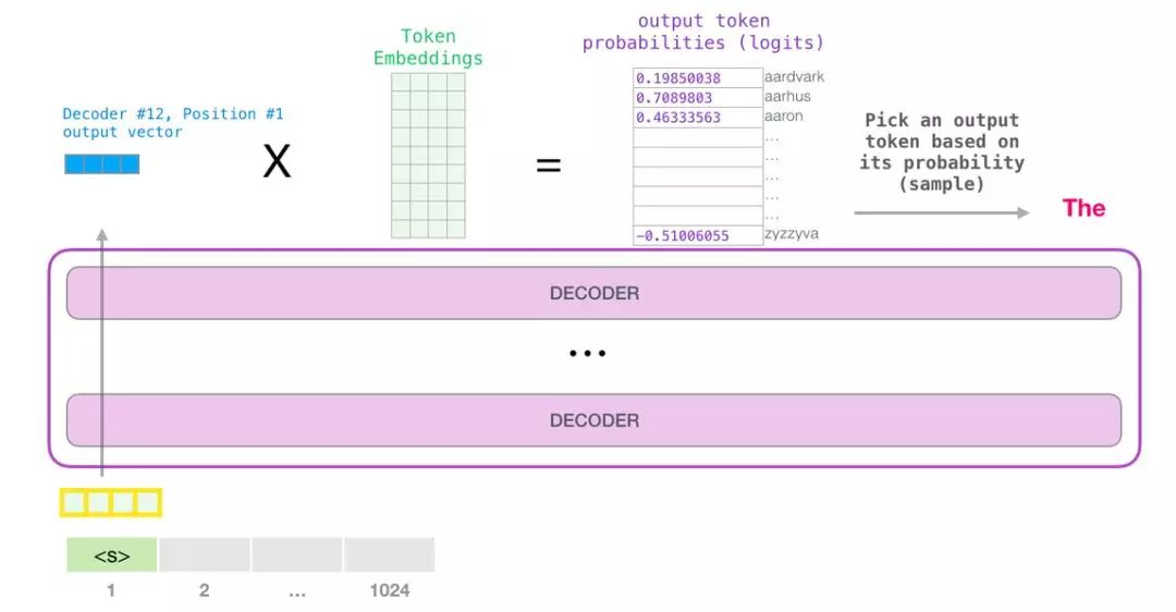 这样,模型就完成了一轮迭代,输出了一个单词。模型会接着不断迭代,直到生成一个完整的序列——序列达到 1024 的长度上限或序列中产生了一个终止符。