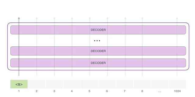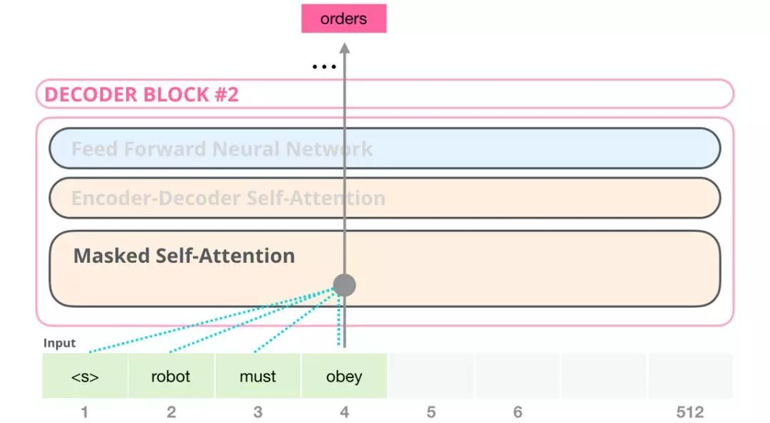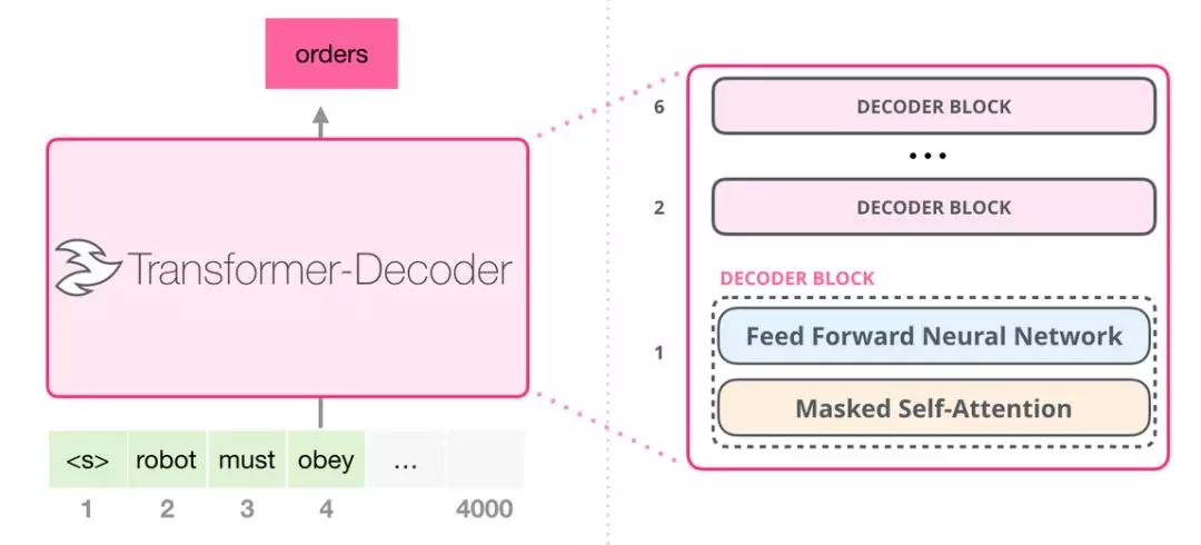 图中所有的解码器模块都是一样的,因此本文只展开了第一个解码器的内部结构。可以看见,它使用了带掩模的自注意力层。请注意,该模型在某个片段中可以支持最长 4000 个单词的序列,相较于 transformer 原始论文中最长 512 单词的限制有了很大的提升。