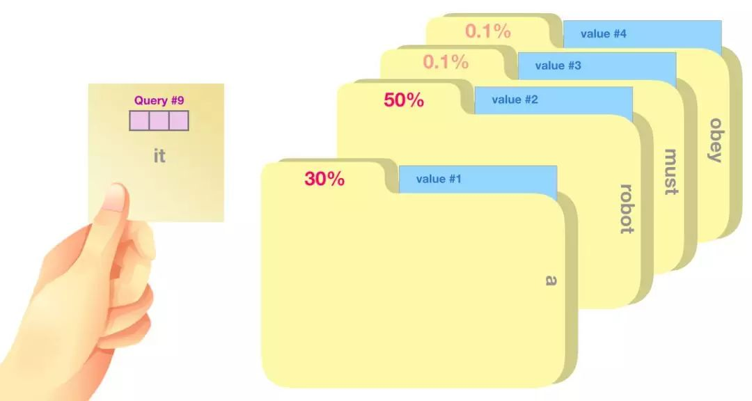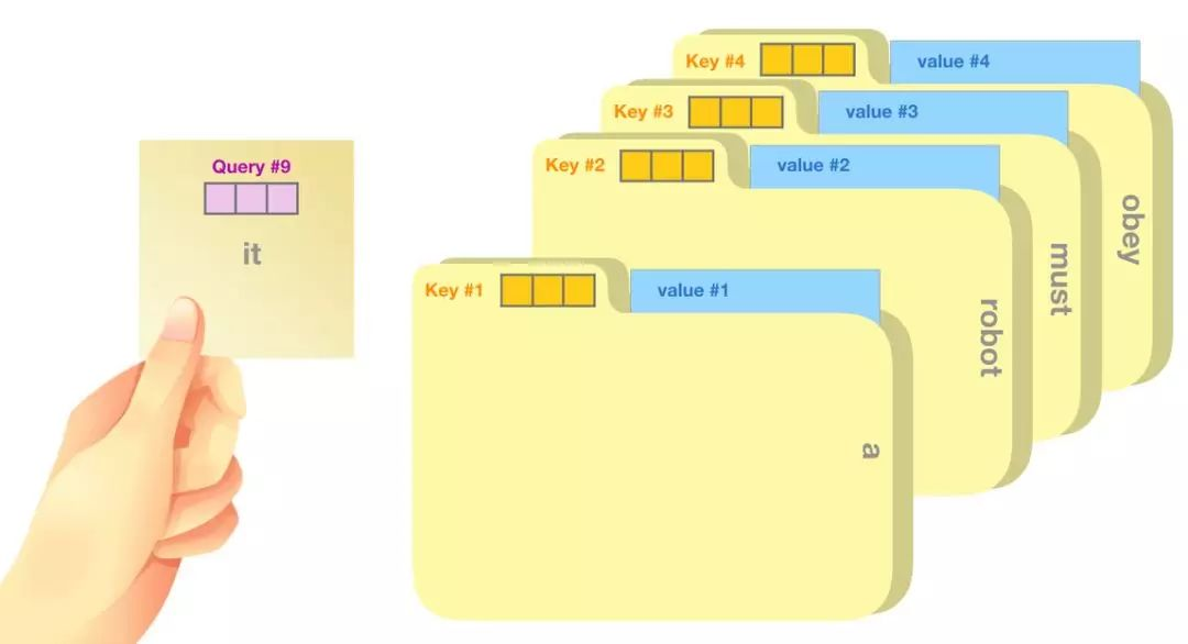 一个简单粗暴的比喻是在档案柜中找文件。查询向量就像一张便利贴,上面写着你正在研究的课题。键向量像是档案柜中文件夹上贴的标签。当你找到和便利贴上所写相匹配的文件夹时,拿出它,文件夹里的东西便是值向量。只不过我们最后找的并不是单一的值向量,而是很多文件夹值向量的混合。