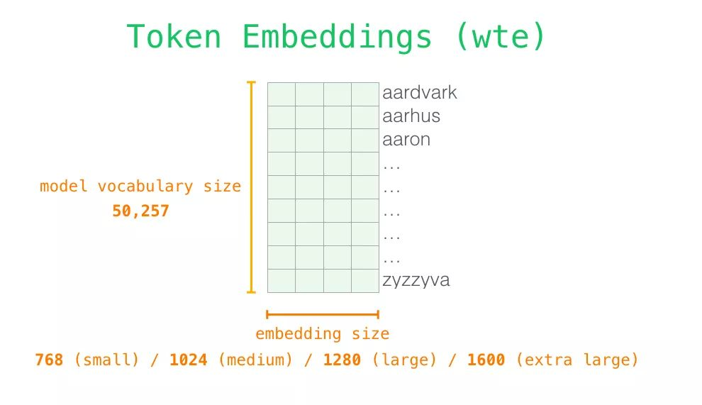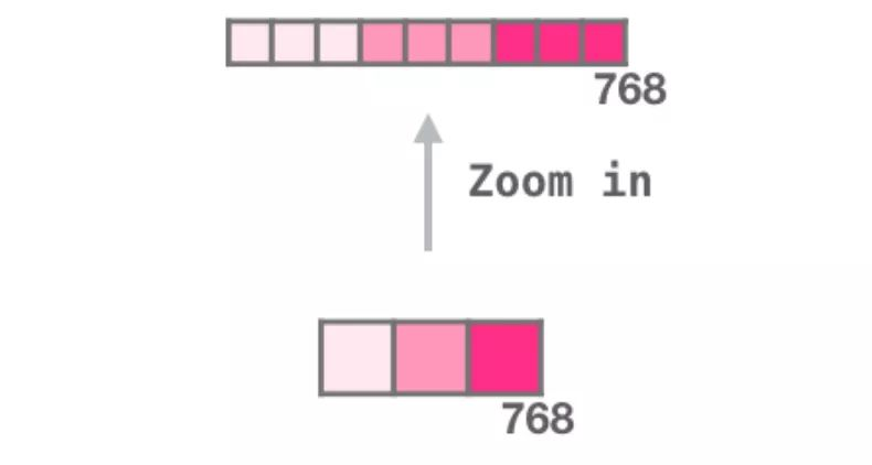 每一行都是一个词嵌入向量:一个能够表征某个单词,并捕获其意义的数字列表。嵌入向量的长度和 GPT-2 模型的大小有关,最小的模型使用了长为 768 的嵌入向量来表征一个单词。