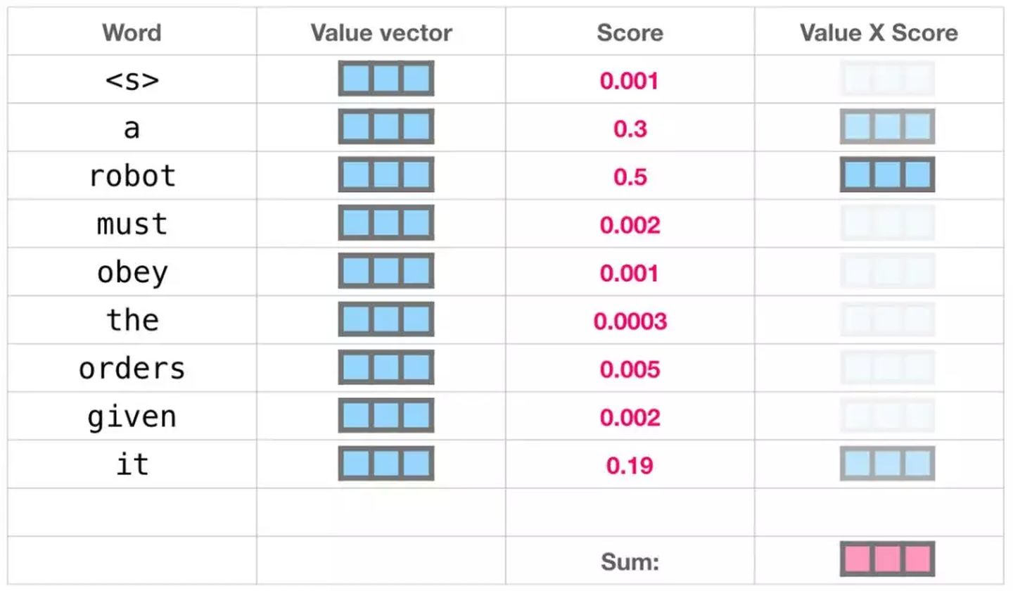 举个例子,最上层的 transformer 模块在处理单词「it」的时候会关注「a robot」,所以「a」、「robot」、「it」这三个单词与其得分相乘加权求和后的特征向量会被送入之后的神经网络层。