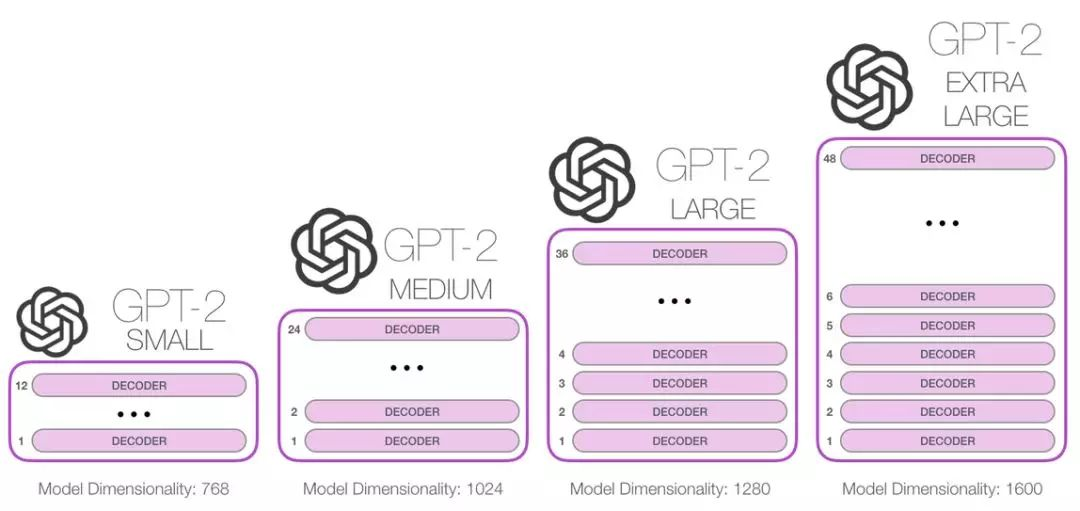 那么我们究竟能将这些模块堆叠到多深呢?事实上,这个问题的答案也就是区别不同 GPT-2 模型的主要因素之一,如下图所示。「小号」的 GPT-2 模型堆叠了 12 层,「中号」24 层,「大号」36 层,还有一个「特大号」堆叠了整整 48 层。
