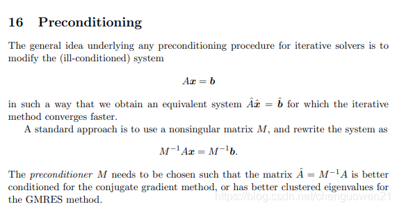 共轭梯度法是一种针对系统矩阵为对称正定矩阵的系统方程求解算法,具体来说就是迭代的求解共轭梯度方向,并求出最佳步长,对于线性方程具有最快的收敛性。具体的实现上,因为具体的系统问题而有不同的预条件方法,如果系统变量为6*6分块,则预条件矩阵也应该是对角的6*6块的逆矩阵,同等情况下,如果仍然执意采用对角线的逆作为预条件则效果较差。...