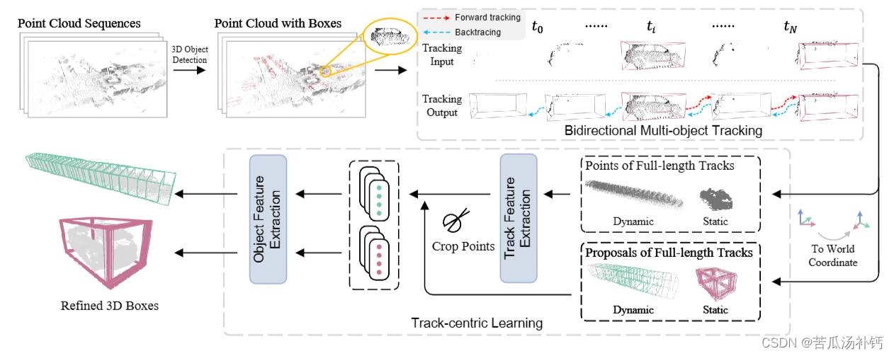 - 在双向跟踪模块中,首先应用前向跟踪过程来填充缺失的框并将轨迹扩展到未来,由红色箭头表示。然后回溯到起始帧并将轨道扩展到过去,用蓝色箭头表示。