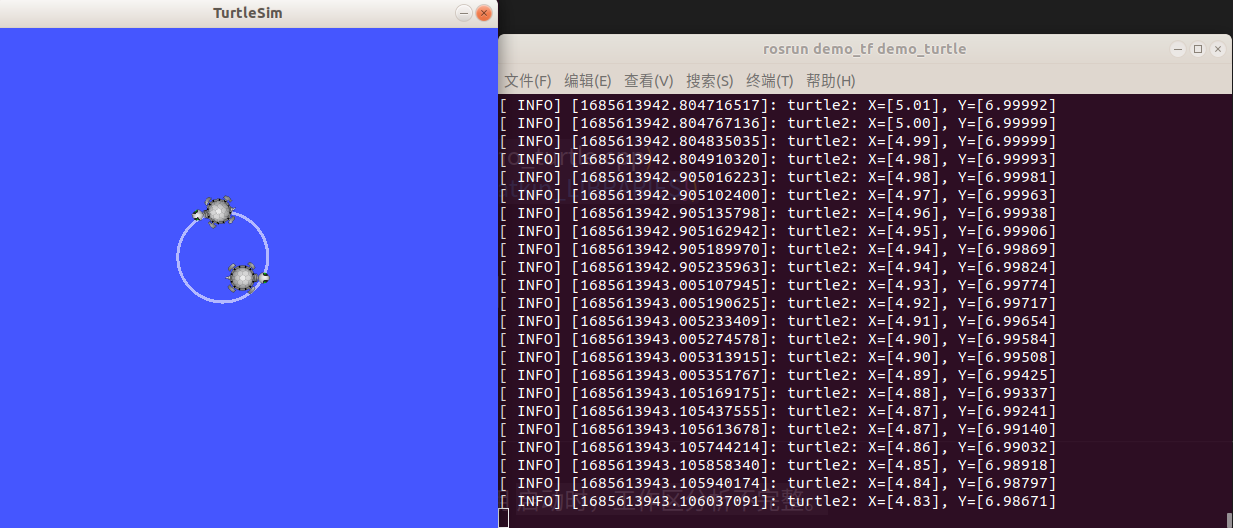 话题与服务编程:通过代码新生一只海龟,放置在(5,5)点,命名为“turtle2”;通过代码订阅turtle2的实时位置并打印在终端;控制turtle2实现旋转运动;