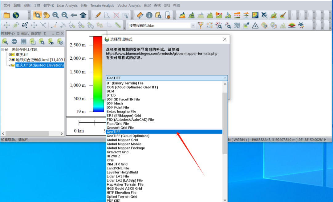 在导出格式选项中选择,GeoTIFF 格式,如下下图:导出后就可以进入切片环节