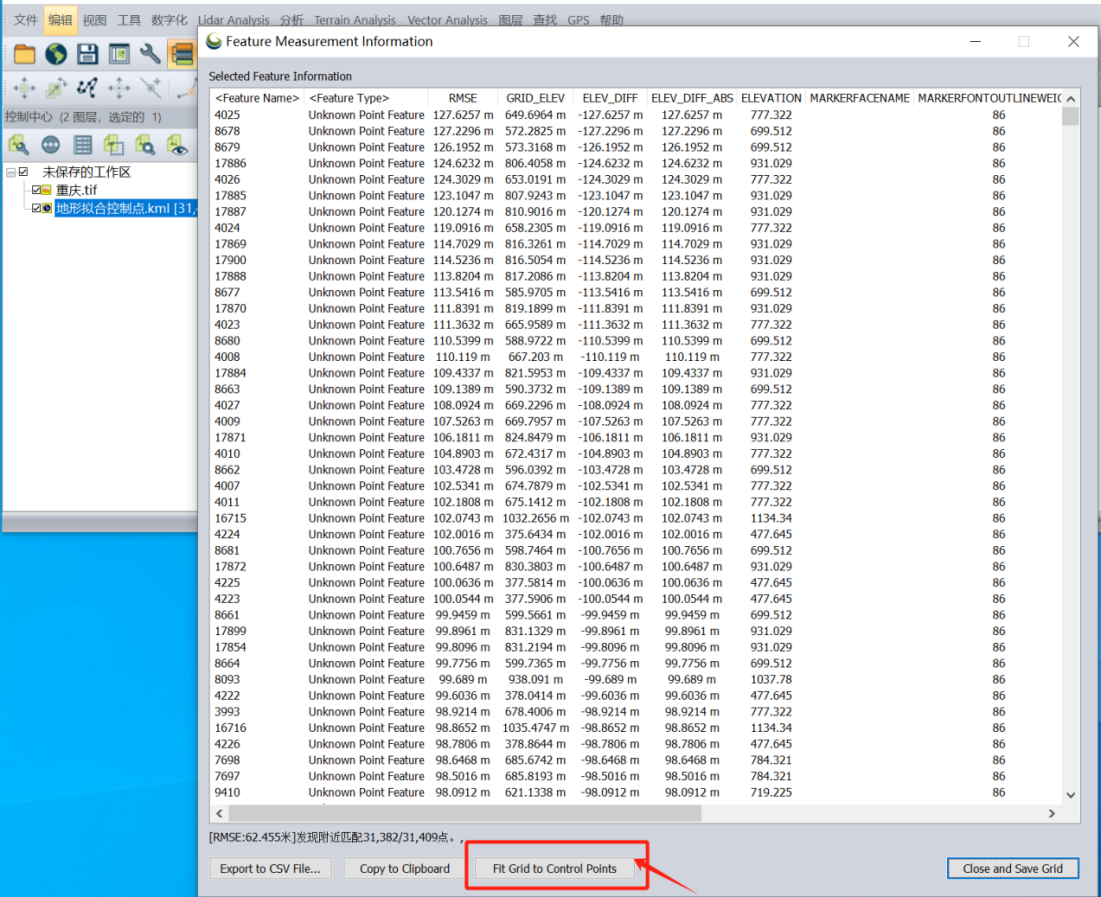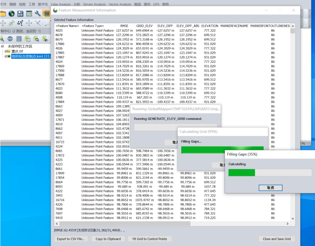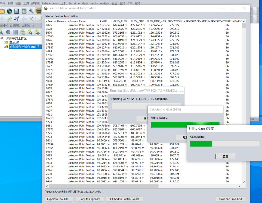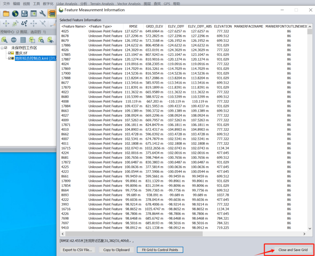 第四步:等待计算完成后弹出如下窗口,点击”将网格适配到控制点”后弹出窗口,点击“是”在导出格式选项中选择,GeoTIFF 格式,如下下图:导出后就可以进入切片环节。第三步:在工具栏依次点击如下图:弹出高程比对窗口,点确定后开始计算差值。第五步:计算结束后,点击“关闭并保持网格”,等待保存结束。按钮,开始拟合高程地形,等待计算过程。