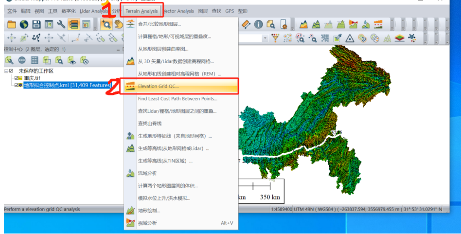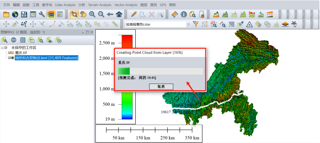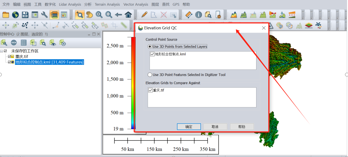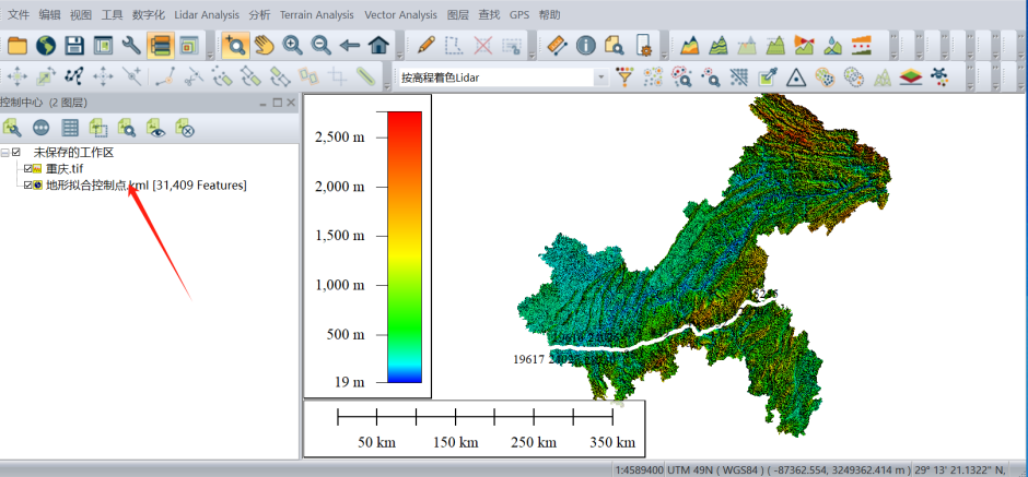 第一步:拖入待拟合的地形文件,以”重庆.tif”为例如下图: