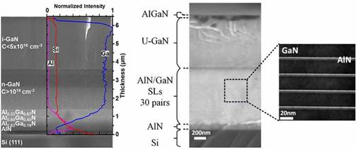 尽管AlN层已经实现在Si衬底上的高质量生长,但是在进行上层GaN材料的外延时,由于生长后冷却时,不同材料之间存在热膨胀系数的差异,往往会导致GaN层中出现裂纹。不同材料之间的晶格失配和热失配使得材料生长过程中会出现应力积累,存在一个材料生长厚度的临界值。当生长厚度大于临界值时,出现应力弛豫,材料破裂。在生长过程中,还会因为各种失配引入了大量的位错和缺陷,如穿通位错、N空位等。这些位错和缺陷的存在使得器件特性退化,缓冲层漏电加剧,器件过早击穿。为了解决这一问题,研究人员们对外延过程中的缓冲层进行了多种结构设计的探索。如AlGaN缓冲层、Al(Ga)N/GaN超晶格缓冲层等。图4分别给出了Al组分阶梯变化的AlGaN缓冲层和AlN/GaN超晶格缓冲层。