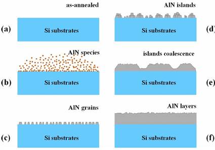 为了解决上述问题,提出了脉冲激光淀积(PLD)技术,它采用高能脉冲激光烧蚀生长靶,使AlN前驱体在衬底上扩散和迁移,从而在相对较低的生长温度下实现氮化物的外延生长[18]。1995年,Vispute等人首次报道了通过脉冲激光烧蚀AlN靶材实现了Si衬底上单晶AlN的生长[19]。2010年,Li等人报道了PLD外延生长高质量AlN薄膜,并分析了靶材与Si衬底之间的距离对外延AlN薄膜质量的影响以及PLD生长机制[20]。图3给出了用PLD在Si衬底上生长AlN薄膜的机理示意图。