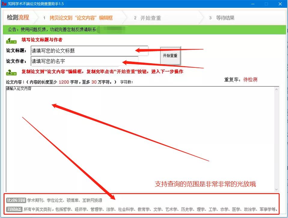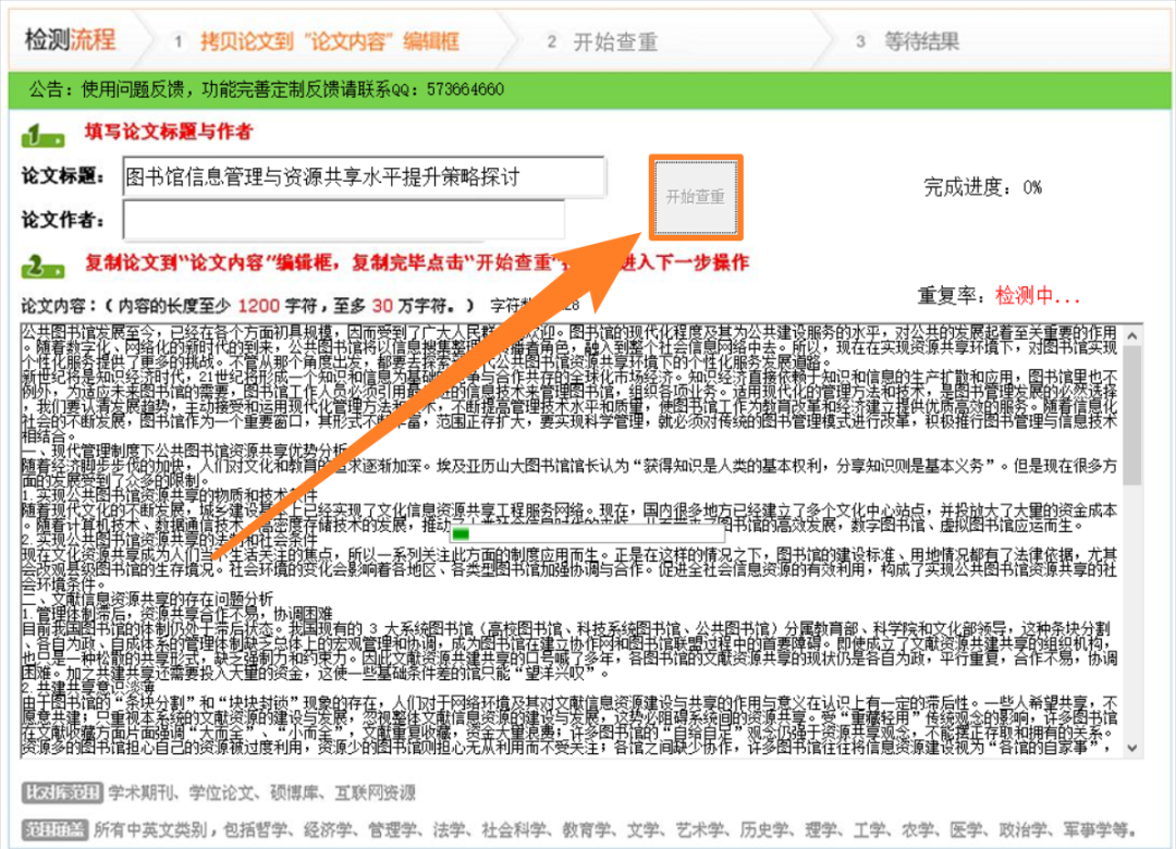 然后大家直接点击开始使用,进入到这个界面,看到这个界面我相信大家都会使用了吧,查重的范围是非常非常的广泛的。