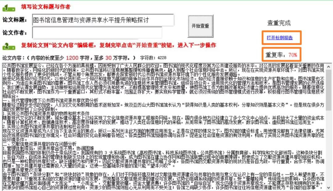 那大家只需将自己的论文标题和论文分开复制粘贴进去就可以了,然后点击开始查重,不一会儿就出来效果了。
