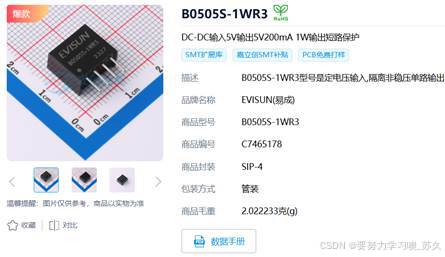 品牌名称:EVISUN(易成);商品型号:B0505S-1WR3;商品封装:SIP-4;隔离电源模块:输出功率 1W;工作电压4.5V~5.5V;转换效率86%;输出电压5V;输出电流(最大值) 200mA;最大容性负载2400uF;隔离电压(Vrms)1.5kV;特性 短路保护。