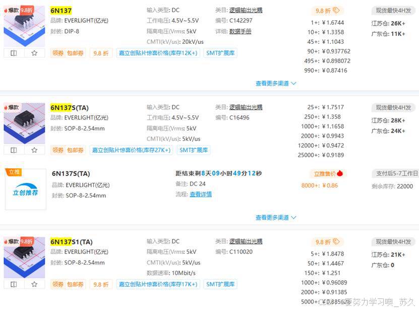 品牌名称:EVERLIGHT(亿光);商品型号:6N137;商品封装:DIP-8;逻辑输出光耦:输入类型 DC;工作电压4.5V~5.5V;隔离电压(Vrms)5kV;CMTI(kV/us) 20kV/us;数据速率10Mbit/s;通道数 1;工作温度 -40℃~+85℃;传播延迟(tpLH)75ns;传播延迟(tpHL)75ns;输入阈值电流(FH)2.5mA;耗散功率(Pd)100mW;