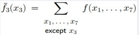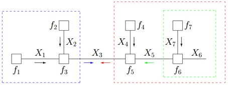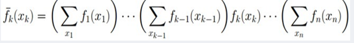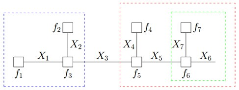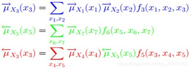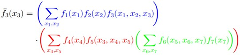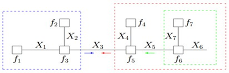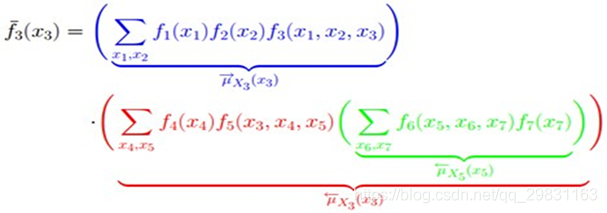 上述计算过程用到了类似“消息传递”的观点,且总共两个步骤。 第一步、对于f 的分解图,根据蓝色虚线框、红色虚线框围住的两个box外面的消息传递得: