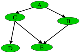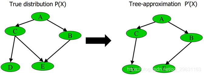 1、删除贝叶斯网络中的若干条边,使得它不含有无向环。 比如给定下图中左边部分所示的原贝叶斯网络,可以通过去掉C和E之间的边,使得它重新变成有向无环图,从而成为图中右边部分的近似树结构: