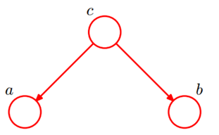 如右图所示, 即在c已知的情况下,对a了解不会影响c的信度,进而也不会影响b的信度,a、b之间的信息通道是被阻塞、被阻断的(blocked),a、b是相互独立的。但是在c未知的情况下,对a的了解对影响关于c的信度,进而影响关于b的信度。