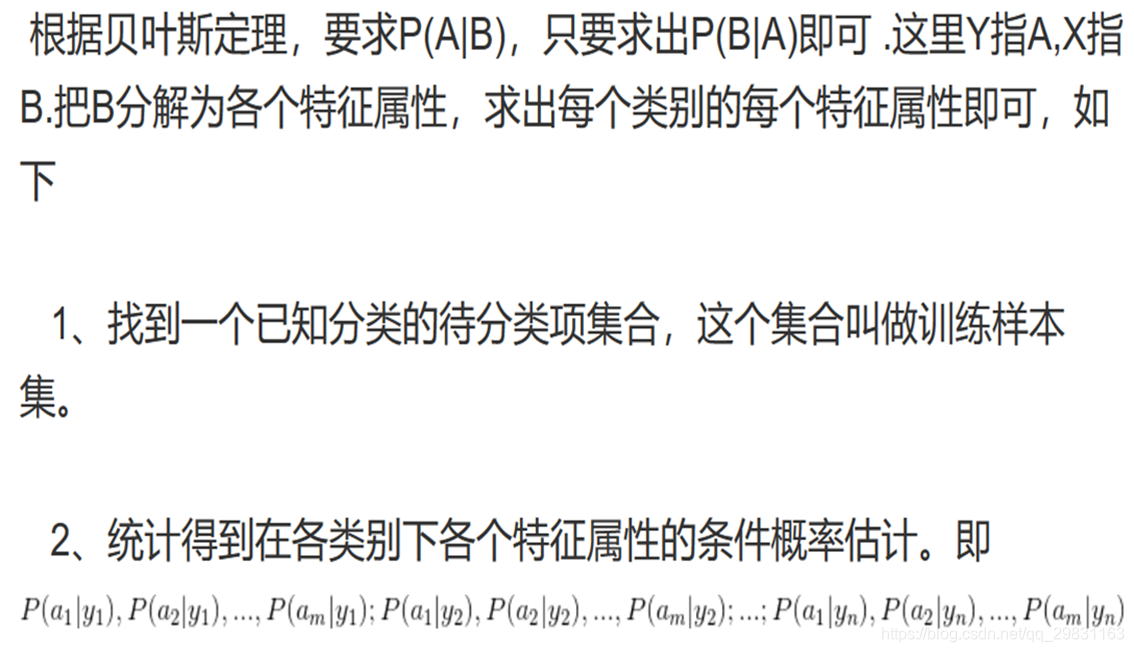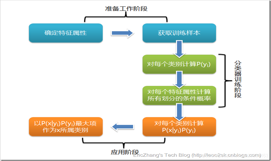 分类器训练阶段的任务就是生成分类器,主要工作是计算每个类别在训练样本中的出现频率及每个特征属性划分对每个类别的条件概率估计,并将结果记录。其输入是特征属性和训练样本,输出是分类器。