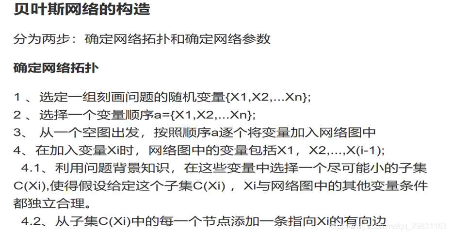贝叶斯网络引入了一个条件性独立(conditional independence)概念:即图中任意结点v在给定v的parent结点的情况下,与图中其它结点都是独立的,也就是说P(v|par(v),x1,x2...,xn) = P(v|par(v))。par(v)表示v的parent结点集,x1,x2,...,xn表示图中其它结点。
