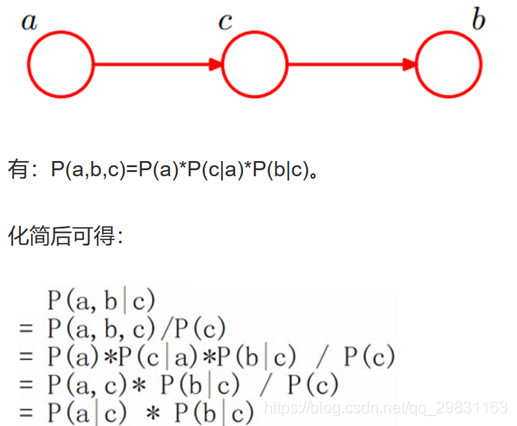 有P(a,b,c)=P(c)*P(a|c)*P(b|c),则:P(a,b|c)=P(a,b,c)/P(c),然后将P(a,b,c)=P(c)*P(a|c)*P(b|c)带入上式,得到:P(a,b|c)=P(a|c)*P(b|c)。
