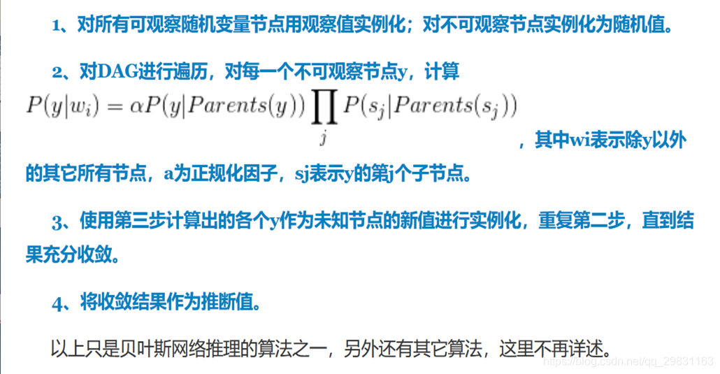 2、训练贝叶斯网络参数——估计出各节点的条件概率表。这一步也就是要完成条件概率表的构造,如果每个随机变量的值都是可以直接观察的,那么这一步的训练是直观的,方法类似于朴素贝叶斯分类。但是通常贝叶斯网络的中存在隐藏变量节点,那么训练方法就是比较复杂,例如使用梯度下降法