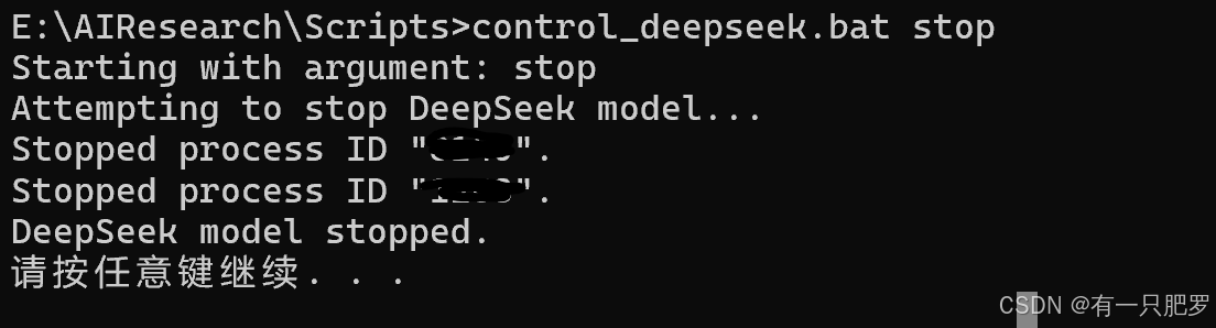 - 关闭服务:运行以下脚本关闭Deepseek服务,返回Stopped process ID xxxx