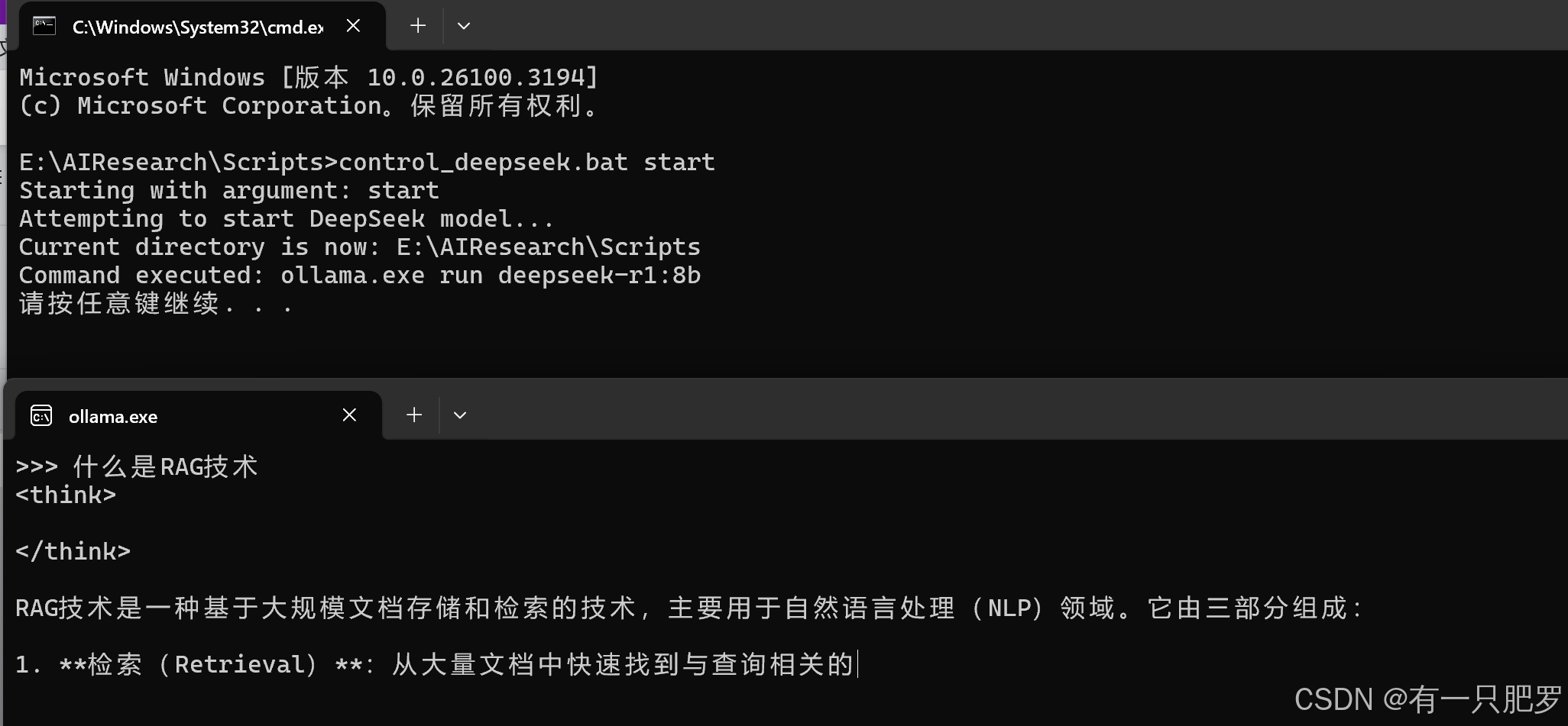 输出运行日志:在CMD运行以下脚本,创建名称script_output.log的Deepseek运行日记:cmd /c "E:\.bat脚本保存的位置\control_deepseek.bat start > E:\.bat脚本保存的位置\script_output.log 2>&1"在部署完Deepseek r1-8b后,我开始思考,deepseek的服务启动后,如果我想关闭服务,或者检测dee