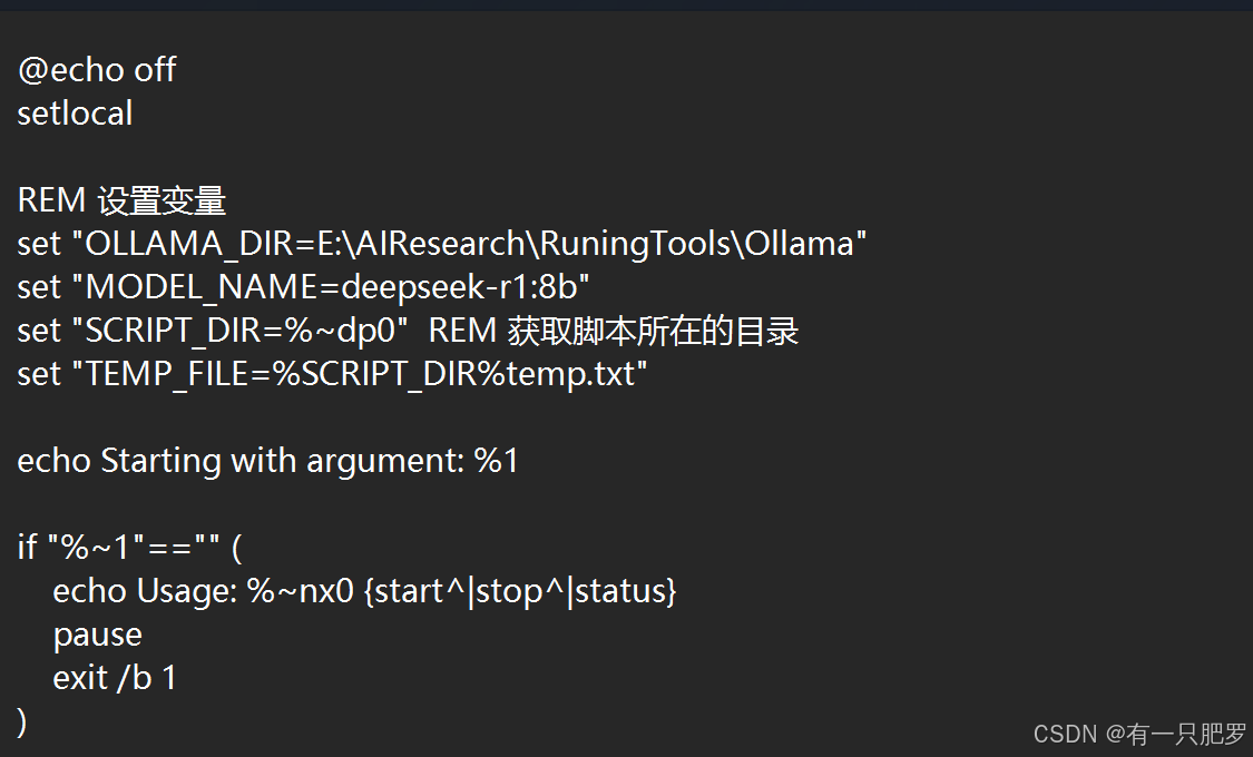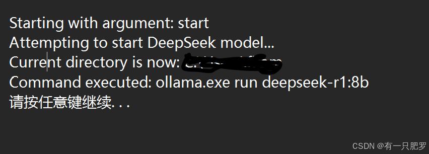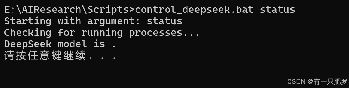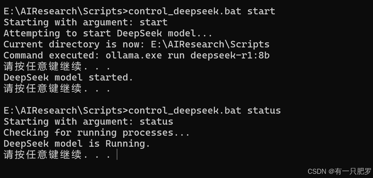 - 输出运行日志:在CMD运行以下脚本,创建名称script_output.log的Deepseek运行日记:cmd /c "E:\.bat脚本保存的位置\control_deepseek.bat start > E:\.bat脚本保存的位置\script_output.log 2>&1"