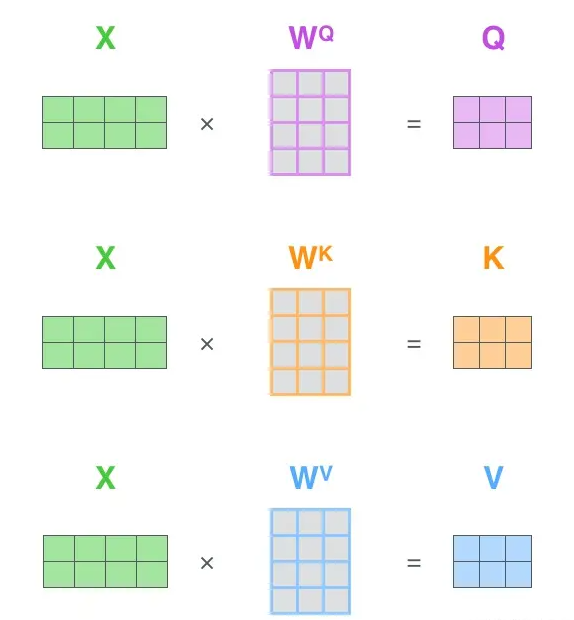 Q为Query、K为Key、V为Value。Q、K、V是从哪儿来的呢?Q、K、V其实都是从同样的输入矩阵X线性变换而来的。我们可以简单理解成: