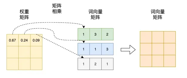 ,将得到的归一化的权重矩阵与词向量矩阵相乘。权重矩阵中某一行分别与词向量的一列相乘,词向量矩阵的一列其实代表着不同词的某一维度。经过这样一个矩阵相乘,相当于一个加权求和的过程,得到结果词向量是经过加权求和之后的新表示,而权重矩阵是经过相似度和归一化计算得到的。