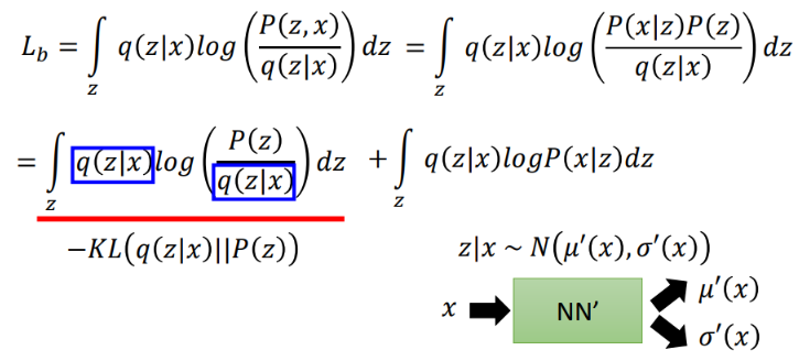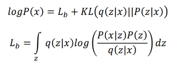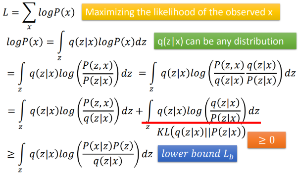 第5行即为第4行前一项,因为KL散度≥0,因此 l o g P ( x ) logP(x) logP(x)存在一个下界,称之为lower bound Lb(也称为ELBO (Evidence Lower BOund) )。