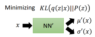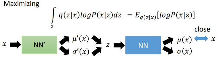 还是将式子进行一些转换,从而转换为两项,其中前一项为-KL(q(z|x)||P(z)),这一项永远≤0。因此优化目标进一步变为最小化KL(q(z|x)||P(z))以及最大化后一项: