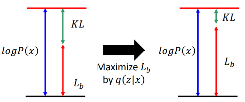如果我们固定P(x|z),仅使用q(z|x)优化Lb,我们知道P(x)与q(z|x)无关,因此最终似然大小固定,随着Lb变大,因此KL(q(z|x)||P(z|x))变小,如下图所示: