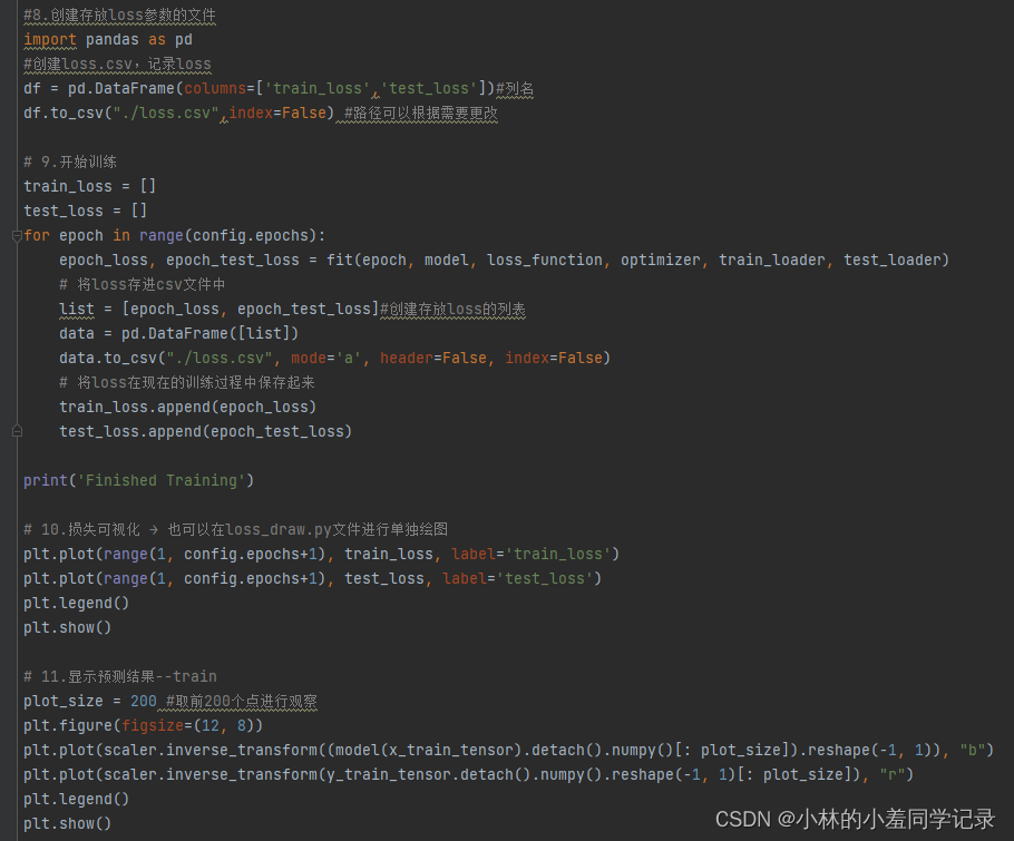 该py文件实现整体训练流程并做绘图操作。依次实现加载数据、数据标准化、取出WIND数据、划分训练集测试集、数据转化为Tensor、形成数据更迭器、载入模型、定义损失、定义优化器、开始训练、损失可视化、显示预测结果。