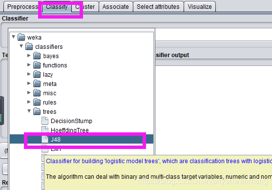 点击“more”,将会展示更多关于J48决策树分类器的信息。