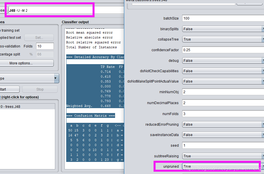 更改配置信息:点击“J48-U-M 2”,将unpruned(未修剪)改成true