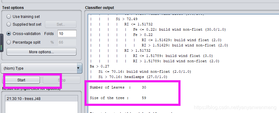 重新点击start,得到新的运行结果。(未修剪的决策树运行的结果)