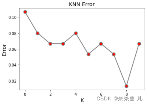 从上图中,我们可以看出,当K=8的时候,该KNN分类器的误差最小,但是简单的一次实验具有随机性,如果大家想要得到更精确的数据,可以多做几次实验,观察一下K的分布规律,找出最优的K值。