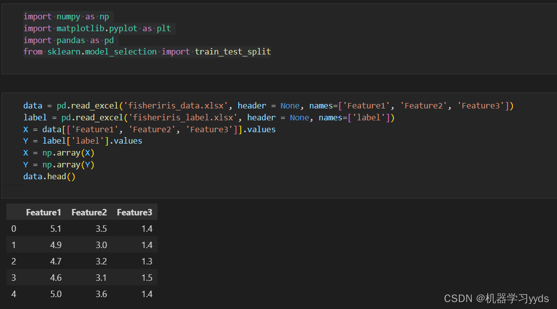 因为我们的数据集大小是 150 X 3 ,所以我们在读入数据的时候自定义数据的第一列为Feature1,第二列为Feature2,第三列为Feature3.