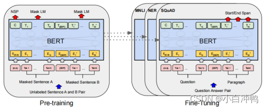 BERT整体框架包含Pre-training和Fine-tuning两个阶段,Pre-training阶段,模型首先在设定的通用任务上,利用无标签数据进行训练。训练好的模型获得了一套初始化参数之后,再到Fine-tuning阶段,模型被迁移到特定任务中,利用有标签数据继续调整参数,知道在特定任务上重新收敛。