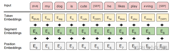 BERT模型的输入由三部分组成。除了传统意义上的token词向量外,BERT还引入了位置词向量和句子词向量。位置词向量的思想与Transformer一致,但BERT并未使用其计算公式,而是随机初始化后放入模型一同训练;句子词向量实质上是一个0-1表征,目的是区分输入段落中的上下句。这三种不同意义的词向量相加,构成了最终输入模型的词向量。