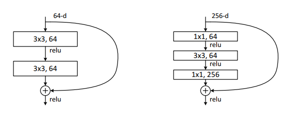 上面5个网络在结构上可以分为2类:一类为ResNet-18和ResNet-34,它们的基本组件为下图中左边的结构;另一类为ResNet-50、ResNet-101和ResNet152,它们的基本组件为下图中右边的结构: