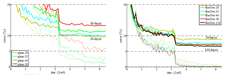 上图中左图为不同深度的传统卷积神经网络,右图为不同深度的残差卷积神经网络。横轴为迭代次数,单位为1×1041 \times 10^41×104,虚线表示训练误差,实线表示测试误差。