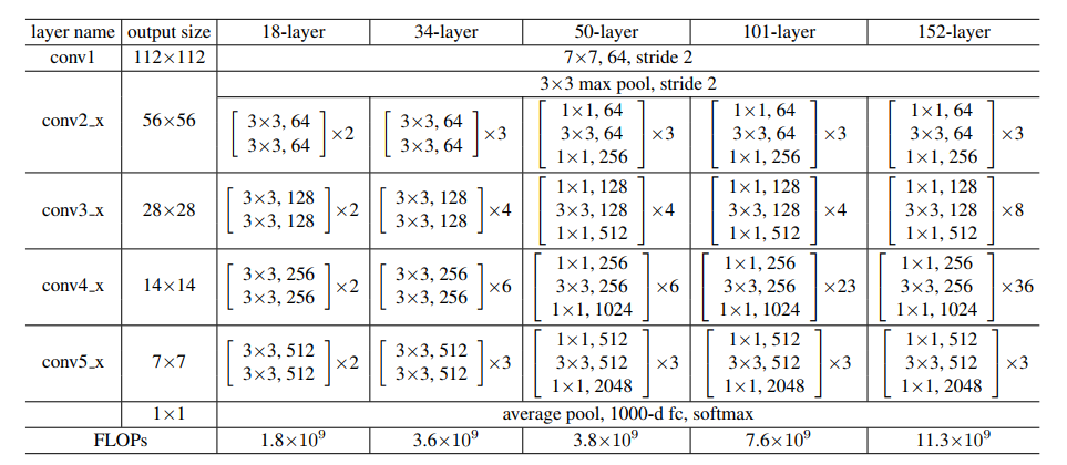 基于上文中提到的结构,作者构建出5个不同结构的卷积神经网络用于ImageNet数据集分类,并根据它们的深度将它们分别命名为ResNet-18、ResNet-34、ResNet-50、ResNet-101、ResNet-152,这些网络的结构如下表所示: