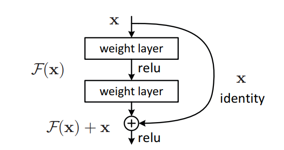 y=F(x,{Wi})+x\mathbf{y}=\mathcal{F}\left(\mathbf{x},\left\{W_{i}\right\}\right)+\mathbf{x}y=F(x,{Wi})+x