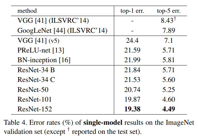 在ImageNet训练集上训练ResNet网络,在验证集上测试,结果如下表所示: