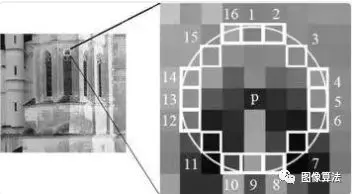 原理:首先,在候选角周围选择16个像素。如果n(n通常为12)连续像素高于候选角加上阈值,或者低于候选角减去阈值,则该点是角(如图4所示)。